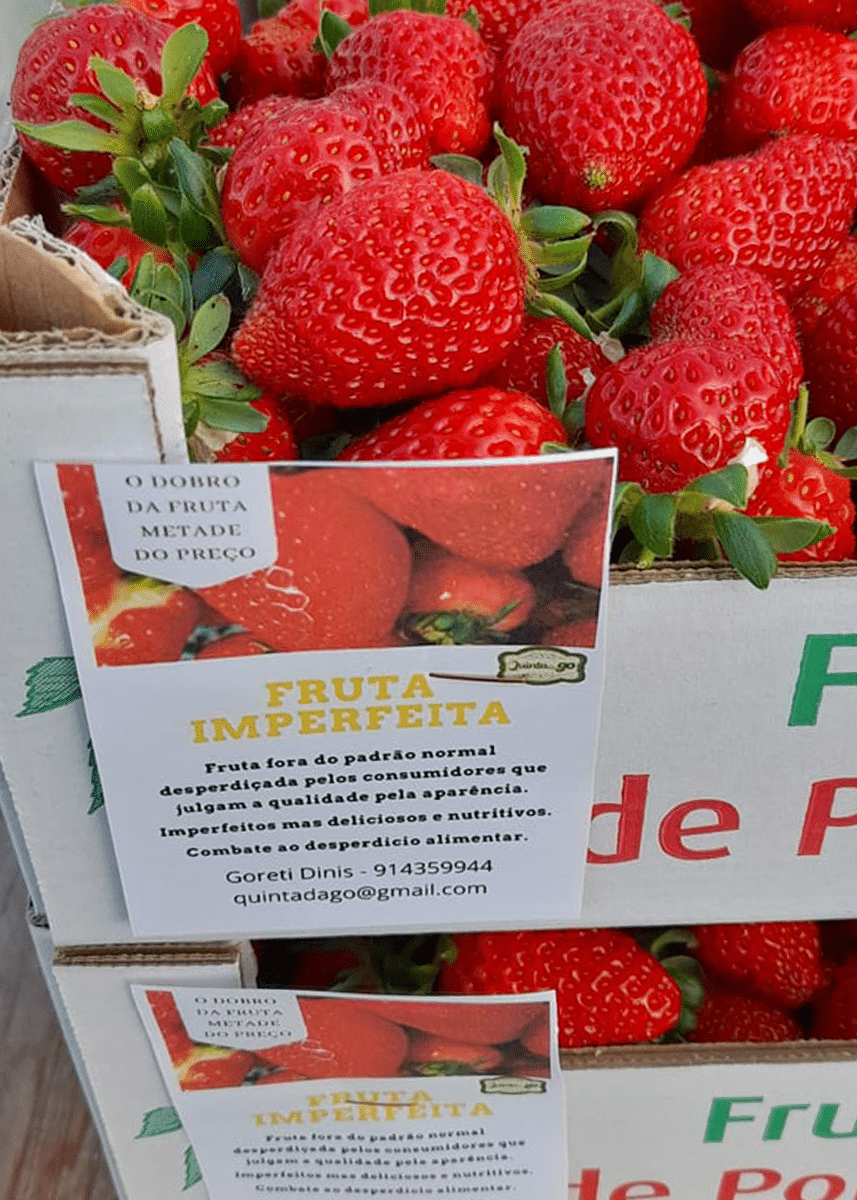 Para garantir o escoamento de toda a produção de morangos em fresco e reduzir o desperdício alimentar, criámos o conceito de Fruta Imperfeita, como forma de escoar a fruta fora do padrão de consumo normal, desperdiçada pelos consumidores, que julgam, muitas vezes, a qualidade pela aparência.